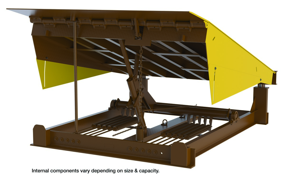 Steel Pull Chain Mechanical Dock Leveler 86"W x 50"L x 24"D Pit Dimensions 30000 Lb. Capacity Brown/YellowThe mechanical dock leveler is constructed of heavy duty checkered plate deck steel for long term support of the steel channel understructure. The dock leveler allows for easy truck loading and unloading. The leveler is engineered and designed for minimum maintenance and features a smooth pull chain operation.