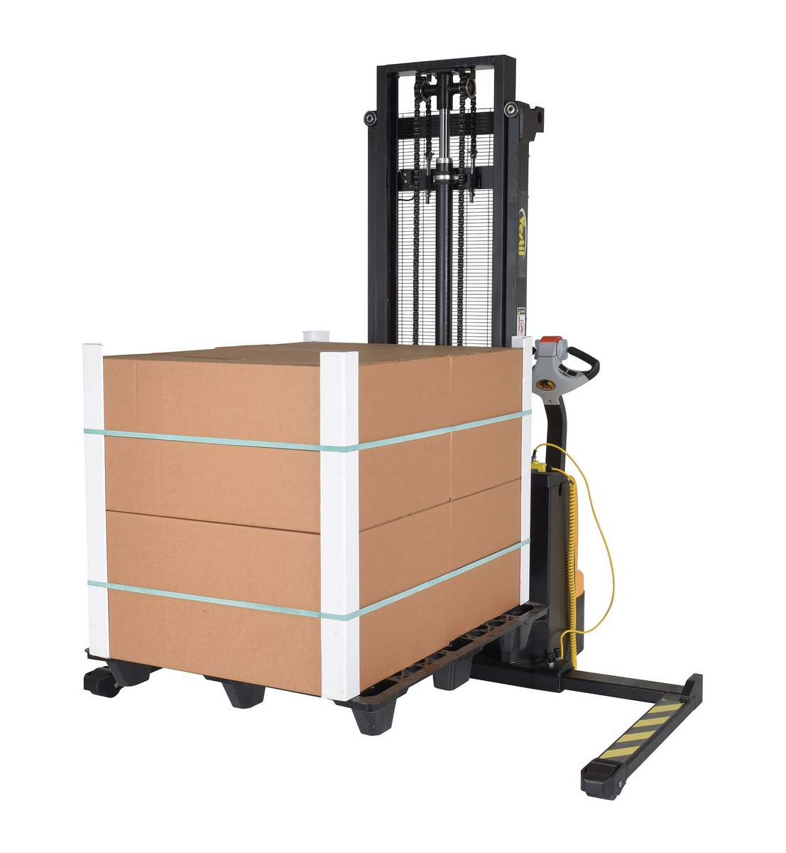 Steel Adjustable Double Mast Stacker 125 In. Raised Height 2200 Lb. Capacity Black / YellowDouble mast fully powered electric stacker transports loads throughout warehouse facilities quickly and with less effort. High torque drive and lift motor handles heavy-duty jobs. Ergonomic handle features easy-to-operate throttle with infinite adjustment of forward and reverse speeds, lift/lower controls, proprietary safety-enhancing emergency reverse function, and horn. Includes an electromagnetic disc brake with automatic dead-man feature that activates when user releases the handle. Powered lifter has two lead acid deep cycle batteries, integral battery charger, and battery level gauge. Stacker rolls smoothly on poly-on-steel steer and load wheels. 3-4 hour operation at full charge - 8 hours when used intermittently.