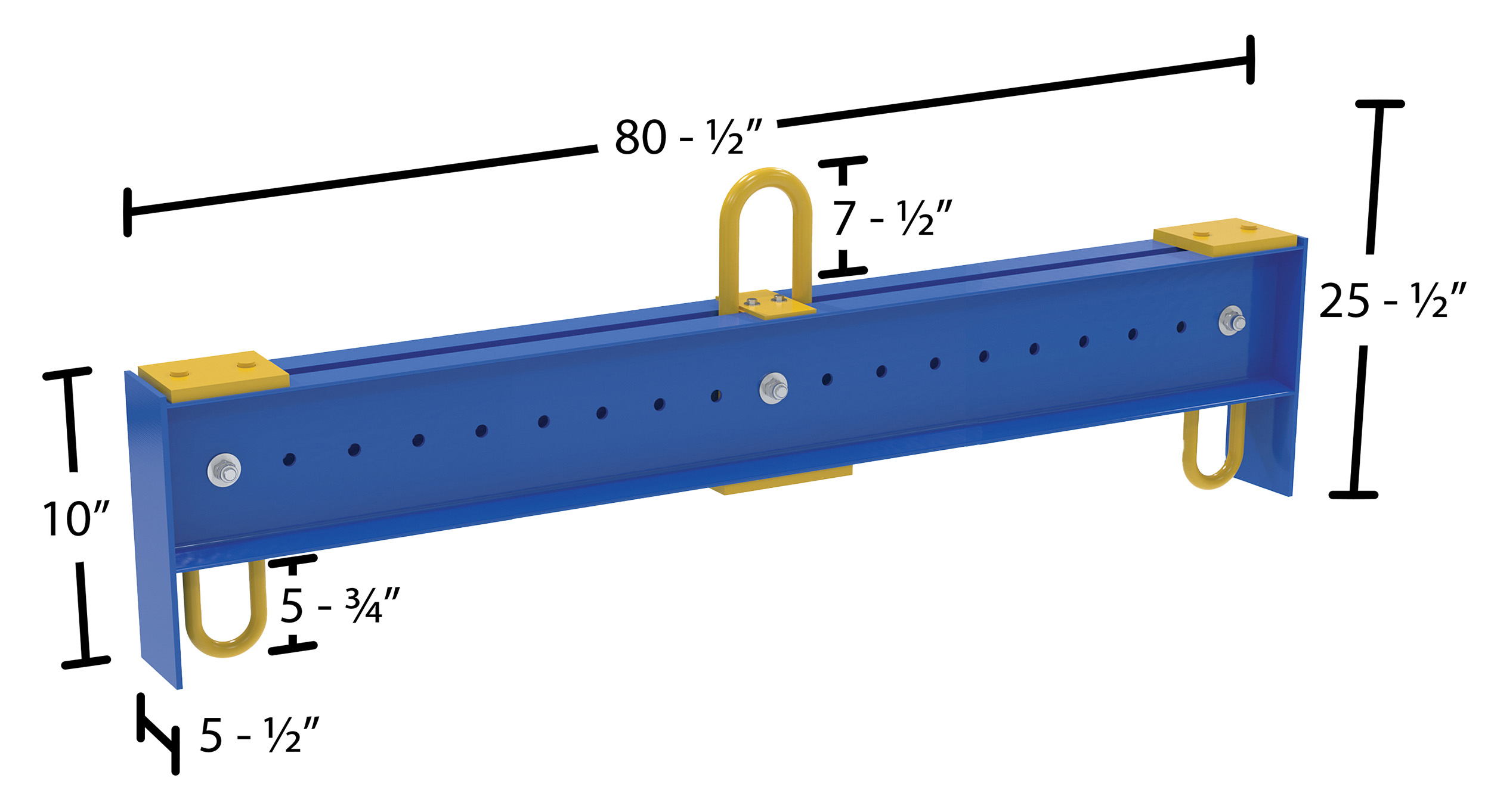 An adjustable spreader beam model lifts uneven loads, all while keeping loads level! Includes one upper bail and two specialty designed bail/sling holders. Bails are adjustable in 4" increments. The bails slide between two C-channels. Meets ASME B30.20-1993 standard. Baked-in powder coated toughness. Polyester lifting slings sold separately.