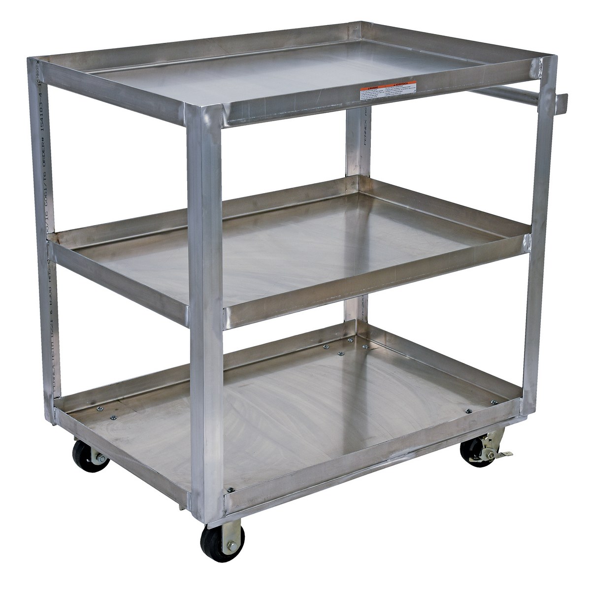 Aluminum Service Cart 3 Shelves 42-5/16 In. x 27-15/16 In. x 41-3/4 In. 660 Lb. Capacity SilverAll welded service cart, made of aluminum is ideal for transporting parts and boxes. This unit has three (3) shelves, a lip is turned up on all shelves to prevent items from sliding off.