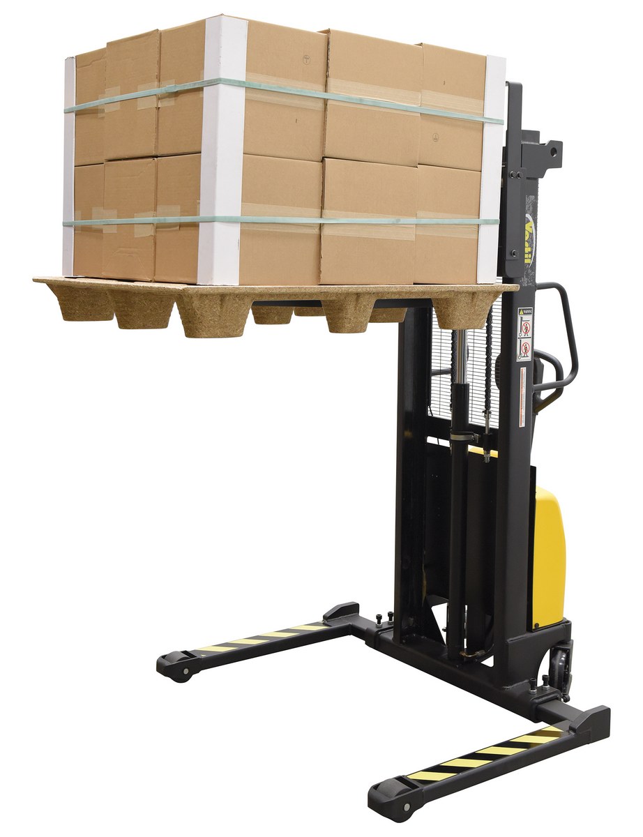 Steel/Plastic Hand Pump DC Powered Stacker with Adjustable Forks and Legs 63 In. Raised Height 2,000 Lb. Capacity Black / YellowAn economical alternative DC powered lift stacker. Ideal for maintenance and commercial applications. This unit can be used as manual hand pump lift or electric powered lift. Ideal when power is not available. High quality hydraulic pump and DC lift system. Compact design and strong steel construction. An economical lift to handle tasks such as transporting dies, molds, and skids. Powered with two (2) 12V AGM batteries. Integral battery charger, battery level gauge, and adjustable lowering speed. All models are easily maneuverable using the standard pull handle. Forks measures 26." wide by 42" long. Individual forks are 6" wide.