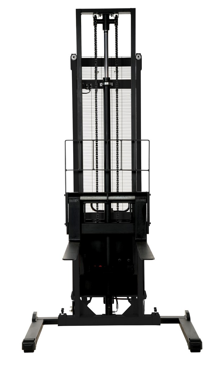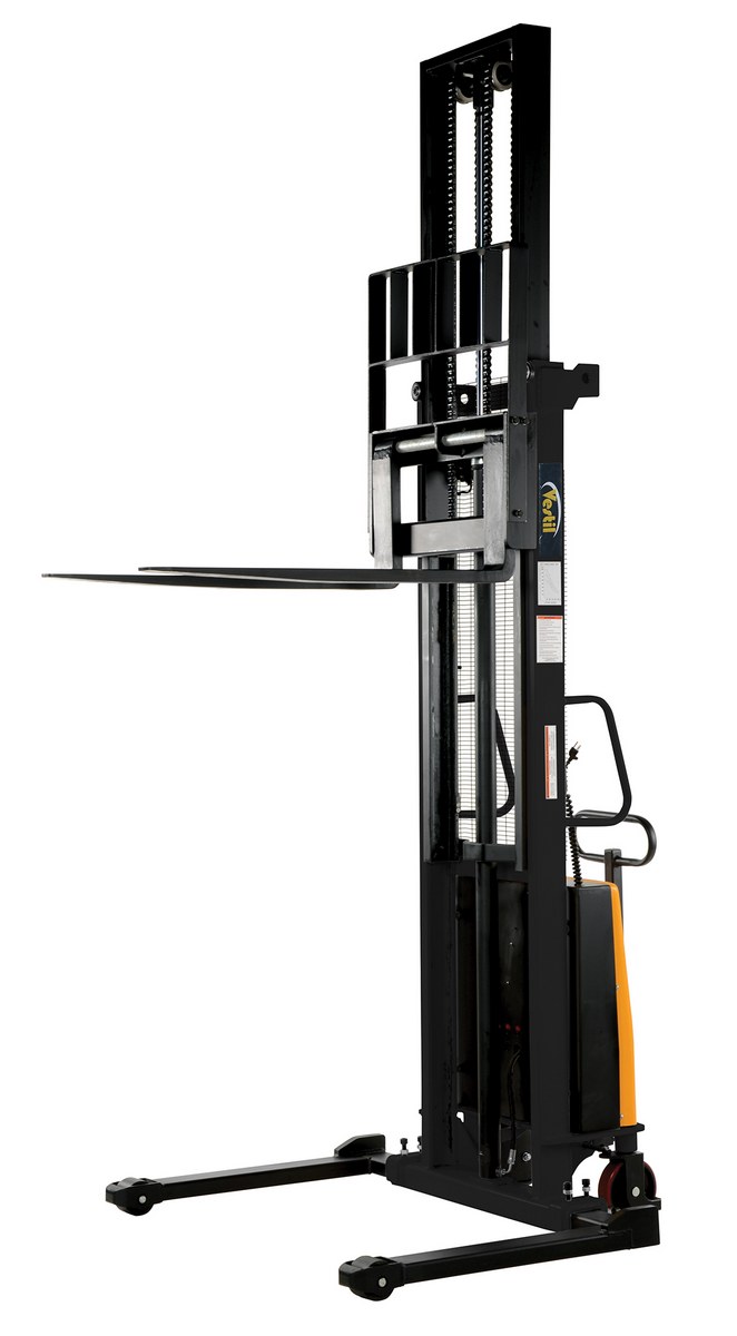 Steel Adjustable Stacker with Powered Lift 150 In. Raised Height 2,000 Lb. Capacity Black / YellowThe stacker powered lift is a semi-electric stacker with a powered lift that will raise and lower loads quickly and easily. The manual push operation stacker is made using high quality material and parts. The stacker is easily maneuvered using the standard pulling handle with adjustable forks and adjustable support legs. The stacker is highly efficient and durable while working with pallets or skids. It features an integral battery charger and battery level gauge.