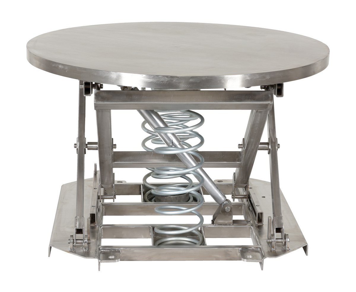 The spring scissor table is ideal for distributing and shipping facilities. The unit allows the user to transfer products from work space to work space, while holding an ergonomically friendly position. The frame is designed of a stainless steel construction, which allows for strength, durability, and a long lifespan. The scissor mechanism raises the unit to the desired height, while the internal spring provides support when unit is being loaded and unloaded. The round top can be manually rotated 360 degrees for improved packaging and handling capabilities.