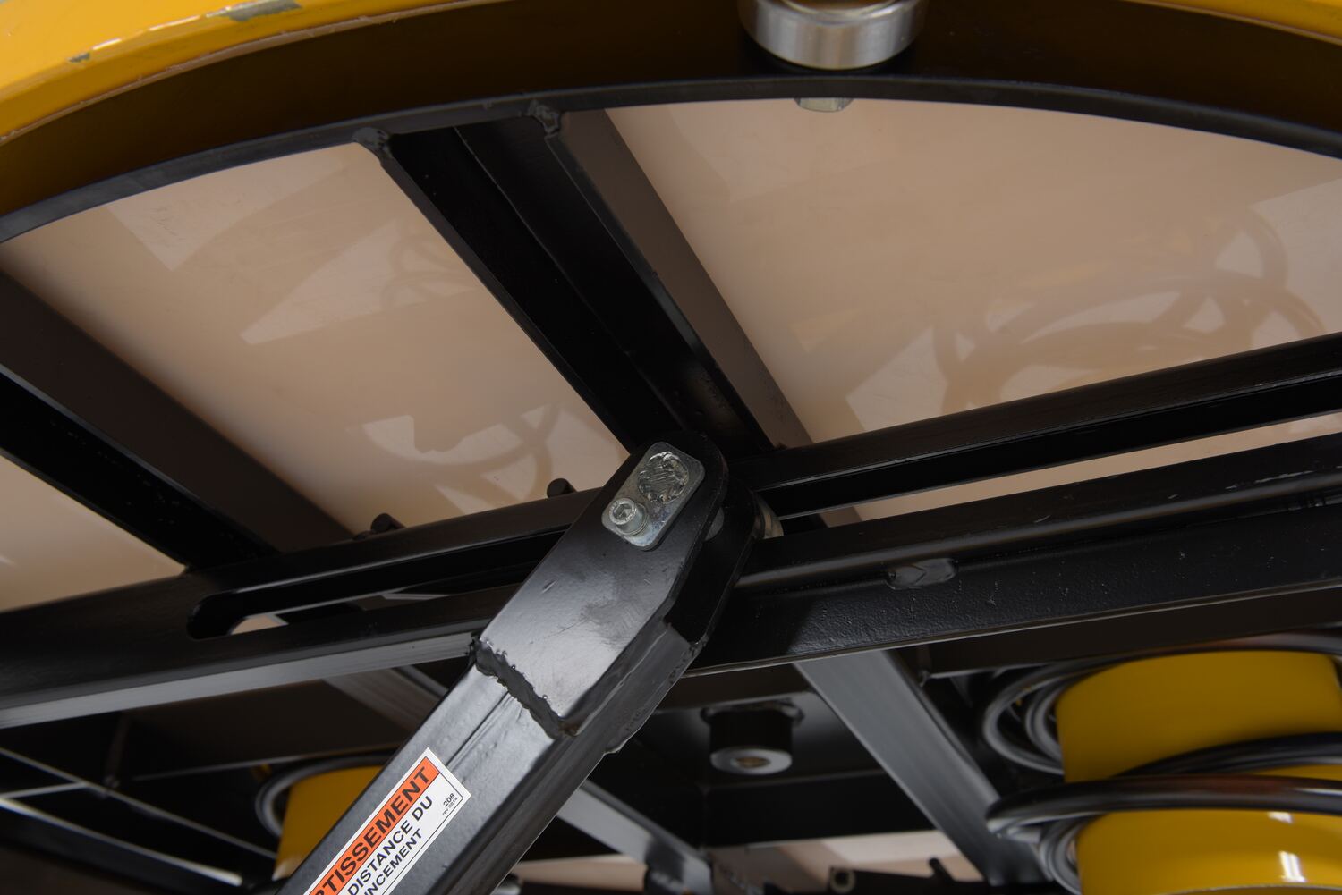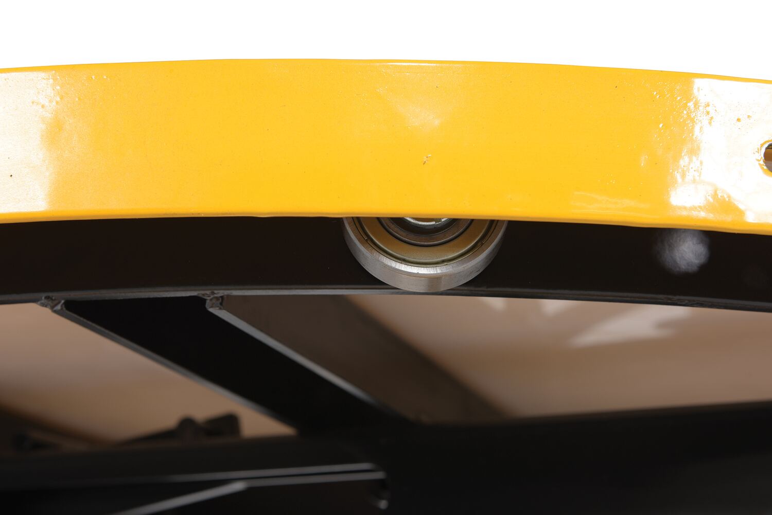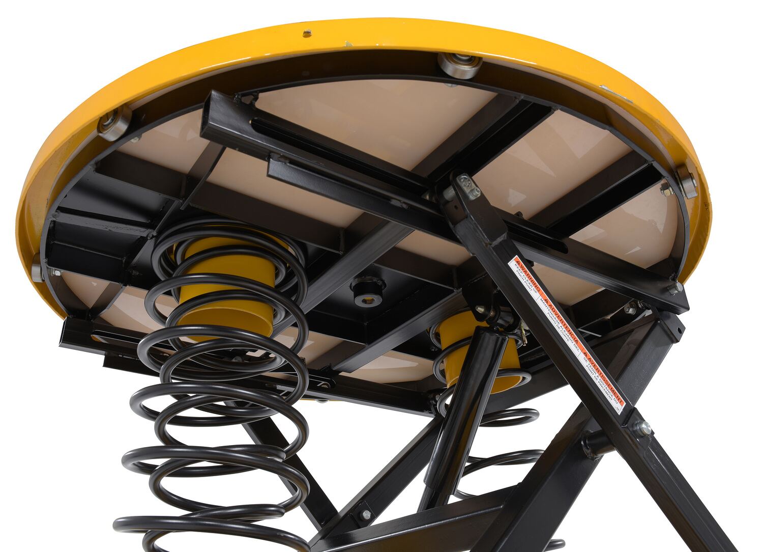 Steel Solid Manual Carousel Top Spring Scissor Table 4,500 Lb. Capacity Black / YellowThe spring scissor table is ideal for distributing and shipping facilities. The unit allows the user to transfer products from work space to work space, while holding an ergonomically friendly position. The frame is designed of a steel construction, which allows for strength and durability. The scissor mechanism raises the unit to the desired height, while the internal spring provides support when unit is being loaded and unloaded. The round top can be manually rotated 360 degrees for improved packaging and handling capabilities.