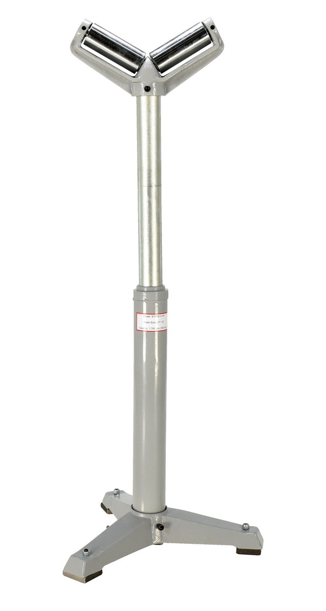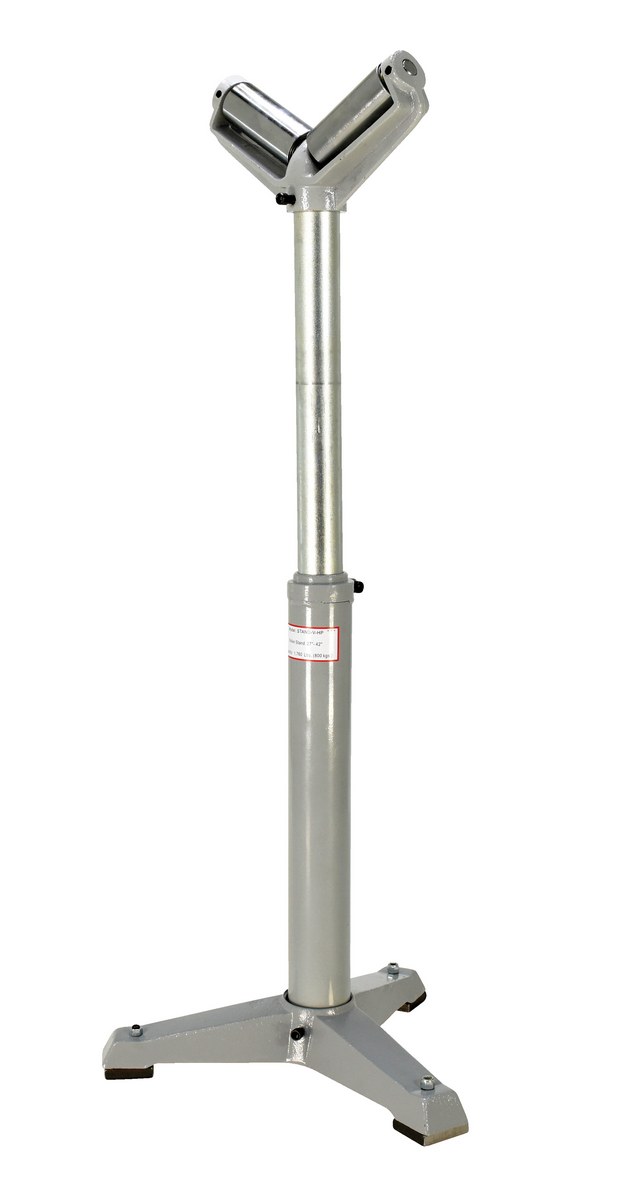 The deluxe roller stand is designed for use as an extra hand when working with long materials. Each stand includes chrome plated rollers and heavy-duty cast-steel base. This deluxe roller stand is a v-groove roller design. The height of each stand is adjusted with a friction lock screw or a gas charged cylinder. The unit is great for use in machine and wood shops and also includes a counter balance mechanism. Models utilize a gas charged cylinder for maximum efficiency and precise positioning. The gas cylinder minimizes adjustment time and limits manual interaction with the unit.