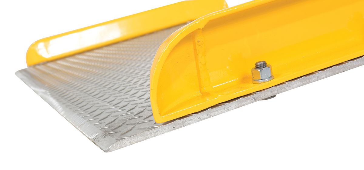 Aluminum Dock Board Steel Curb 60 In. x 36 In. 15,000 Lb. Capacity SilverThe Aluminum truck dock board with steel safety curbs is designed for portability and safety. The deck is made of tough high strength aluminum tread plate. The edges are beveled for smooth entry and exit. Safety curbs are coated yellow and are constructed of steel with cast tapered ends. Steel legs are bolted on for increased durability. Canted locking legs for easier truck portability. Manufactured in compliance with OSHA. The capacity is based upon the heaviest type of equipment used plus the maximum load carried times the single axle rating of total load. Dynamic loading, driver tendencies, speed and frequency of use must be considered. When using three-wheeled fork trucks order dock board with capacity at least four-times the lifting capacity of fork truck. The width of the dock board should be at least fifteen (15) inches wider than the load or equipment passing between the curbs. If the load does not pass between curbs, but is elevated above, add fifteen (15) inches to overall width of equipment.