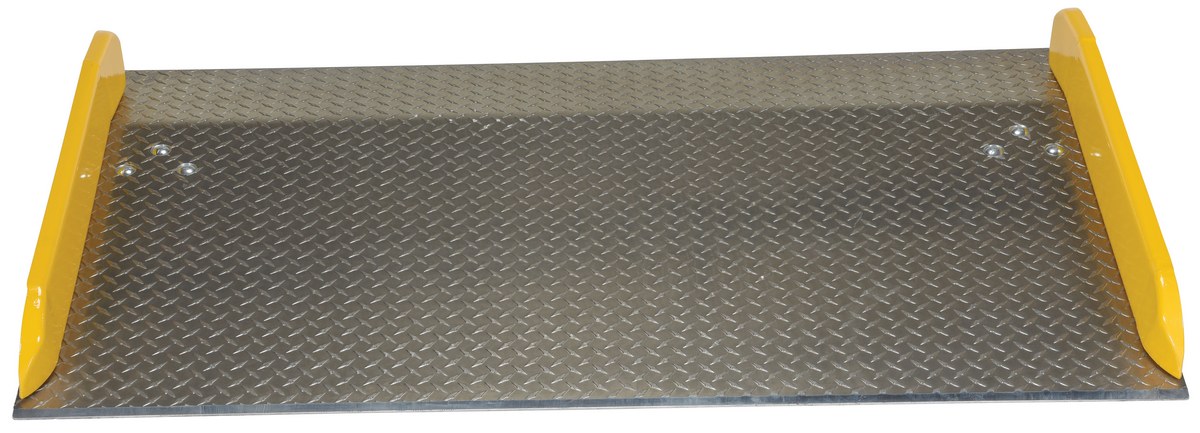 Aluminum Dock Board Steel Curb 60 In. x 36 In. 20,000 Lb. Capacity SilverThe Aluminum truck dock board with steel safety curbs is designed for portability and safety. The deck is made of tough high strength aluminum tread plate. The edges are beveled for smooth entry and exit. Safety curbs are coated yellow and are constructed of steel with cast tapered ends. Steel legs are bolted on for increased durability. Canted locking legs for easier truck portability. Manufactured in compliance with OSHA. The capacity is based upon the heaviest type of equipment used plus the maximum load carried times the single axle rating of total load. Dynamic loading, driver tendencies, speed and frequency of use must be considered. When using three-wheeled fork trucks order dock board with capacity at least four-times the lifting capacity of fork truck. The width of the dock board should be at least fifteen (15) inches wider than the load or equipment passing between the curbs. If the load does not pass between curbs, but is elevated above, add fifteen (15) inches to overall width of equipment.