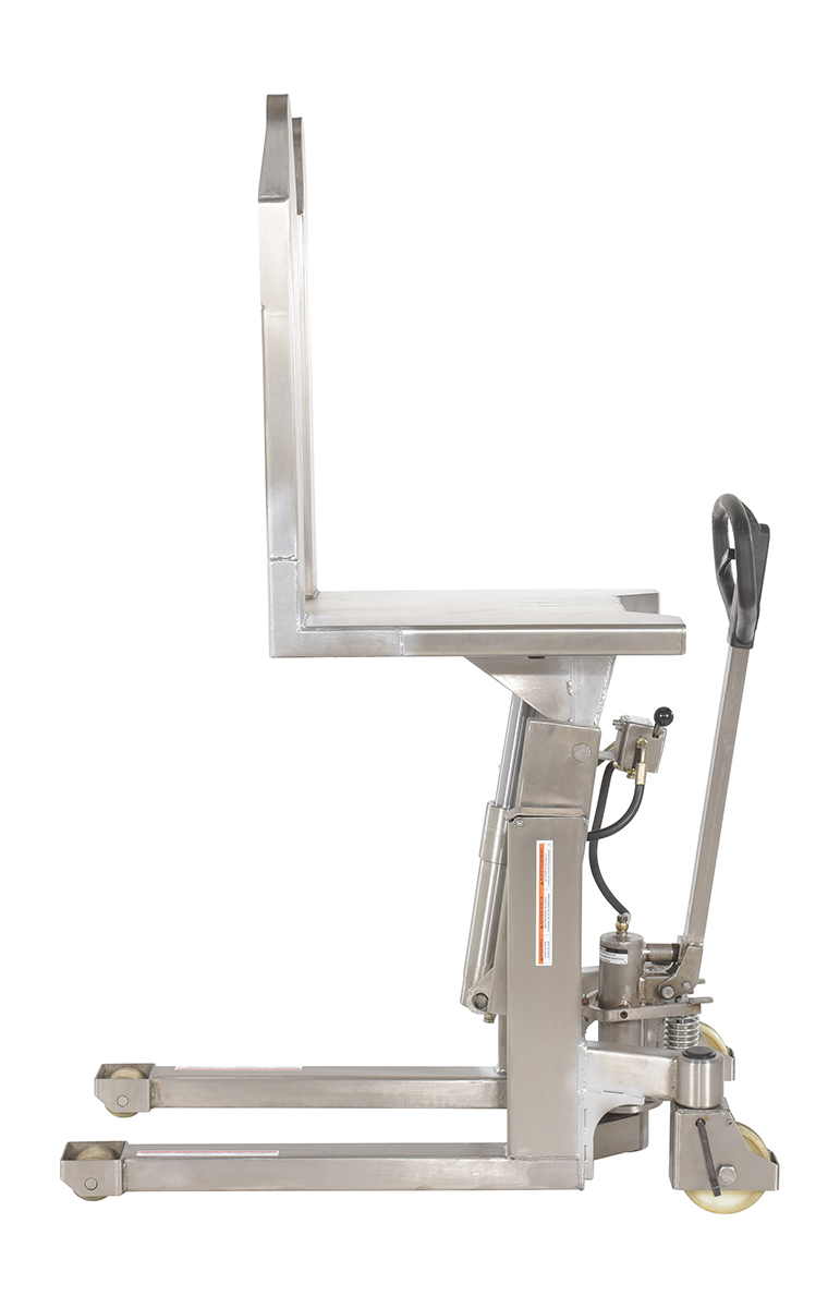 Stainless Steel Tilt Master Manual 2,200 Lb. Capacity SilverThe manual tilt master is great in a variety of settings. Whether it's lifting, tilting, or just transporting; this design is the one for the job. This unit is perfectly manufactured to help maneuver crates, boxes, or pallets with an open bottom. It also provides the user with an ergonomically correct position to reach loads easily without the need for bending down or excessively reaching over. The lift rolls smoothly on a polyurethane swivel caster with brake and foot protectors. The stainless steel construction provides strength and durability throughout a lifetime of daily use.