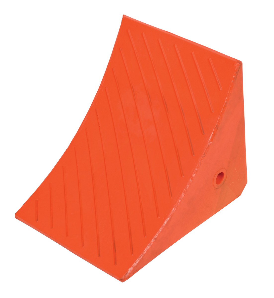 The urethane Wheel Chock is bright orange for greater visibility. Incoming and outgoing drivers can easily see for added safety. Safety tread on chock face provides better grip and reduces slippage. There is a mold-in hole through width of chock for attaching chain (chain not included).